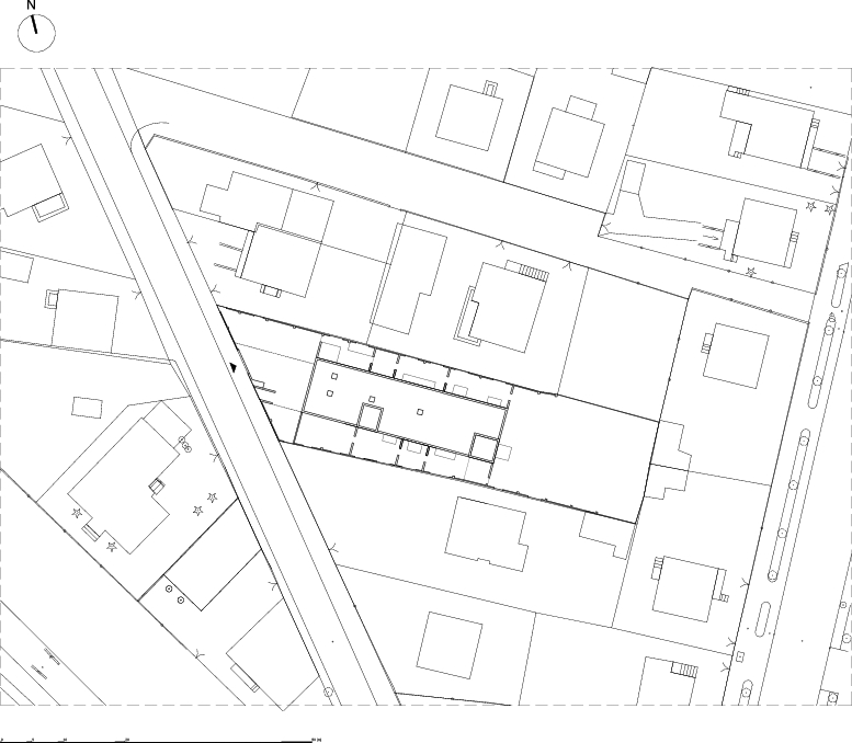 Dom mieszkalny usytuowany jest po stronie zachodniej działki – chodziło nam o to, by uzyskać jak najwięcej miejsca po stronie wschodniej w istniejącym ogrodzie, który pozostaje nienaruszony i ma formę zbliżoną do kwadratu. Pozostała część przestrzeni pomiędzy domem a granicą działki ma szerokość 4 m określoną przez przepisy, co oznacza, że zamiast ogrodu powstaje niefortunny zielony korytarz.