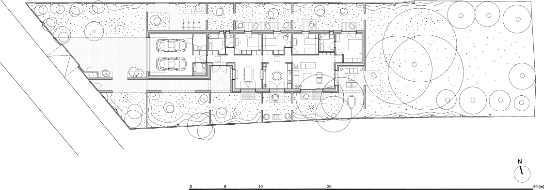 Budynek powstał na długiej i wąskiej działce i zgodnie z przepisami został odsunięty o cztery metry od jej granic. Inwestor chciał, by obiekt był parterowy, dlatego znaczna część możliwego do zabudowania terenu została wypełniona dość standardowym programem. Wąski pas zabudowy znalazł się między dwiema uwolnionymi od niej strefami zieleni. Od północy umieszczono w nim pomieszczenia niewymagające dużej ilości światła – sypialnie i towarzyszące im łazienki oraz pomieszczenia gospodarcze, w tym garaż. Pokój dzienny oraz kuchnię z jadalnią zlokalizowano od południa, zachęcając domowników do wspólnego spędzania czasu. Obie strefy rozdziela ciąg komunikacyjny, który włączono do strefy dziennej, nieznacznie ją dzięki temu powiększając.