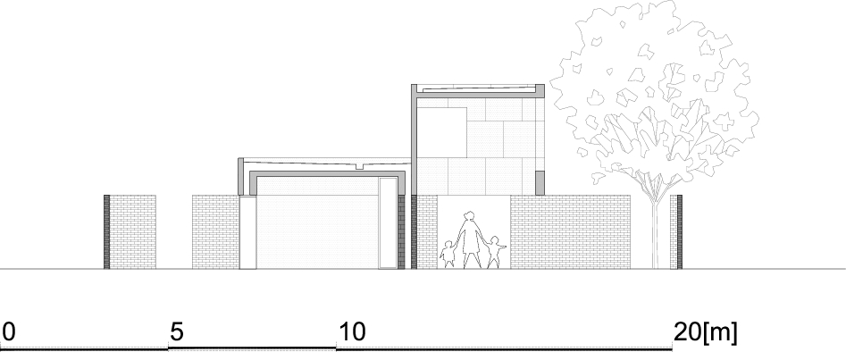 The house was constructed on a large but long and narrow plot. Since according to regulations there must be 4m between the house and the plot border, the house is also long and narrow. On the north side, bedrooms with bathrooms and utility areas; on the south side. the living room, kitchen and dining room; the two zones are separated by a corridor open toward the living areas. Transverse divisions of the building are continued in the garden, where its individual room-sized sections/patios are like functional extensions to the rooms: there is a small terrace/playground in front of the children’s bedroom, and a grill in front of the kitchen.