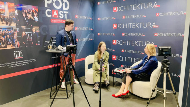Trzy osoby na stanowisku podcastowym 4 Design Days, dwie kobiety siedzą na białych fotelach, mężczyzna stoi, patrząc w ich stronę. W tle widoczny baner z logo Architektura Murator. O wydarzeniu i przyszłości architektury czytaj w Architektura Murator Plus.