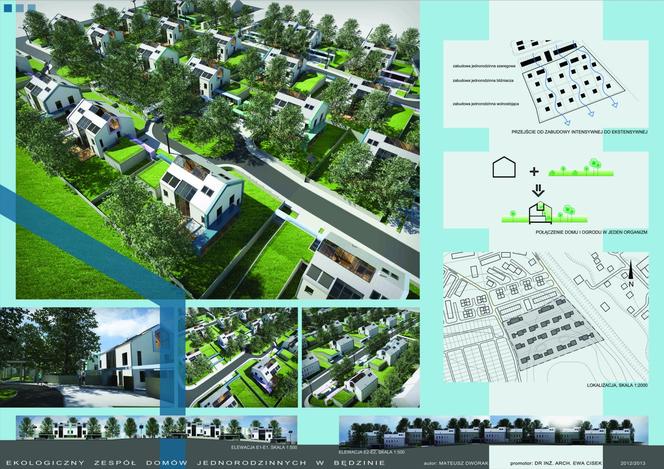 Ekologiczny zespół domów jednorodzinnych w Będzinie. Autor pracy dyplomowej: Mateusz Dworak. Projektant wykorzystał zieleń jako element projektu - od ogrodów zimowych, przez zielone dachy garaży, po zagospodarowanie działek - wszystkie elementy służyć mają poprawie bilansu energetycznego obiektów