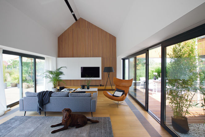 Wnętrze Białego domu w Łomiankach projektu moomoo architects, z drewnianą ścianą akcentową i dużymi przeszkleniami, wychodzącymi na taras. Na pierwszym planie brązowy labrador leży na szarym dywanie, a obok niego stoi nowoczesna szara sofa. Więcej o architekturze tego typu znajdziesz w Architektura Murator Plus.