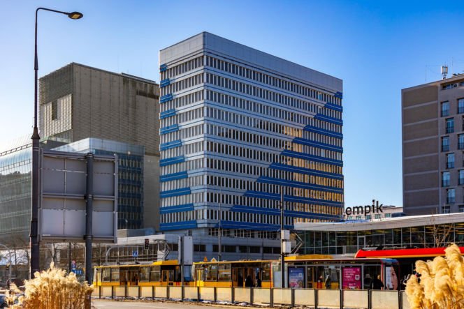 Wysoki biurowiec PKO Banku Polskiego projektu Stępińskiego i Milewskiego przy Marszałkowskiej i Nowogrodzkiej w Warszawie. Budynek o jasnej elewacji z niebieskimi akcentami, dawna siedziba ORS-u. O jego historii przeczytasz na portalu Architektura Murator Plus.