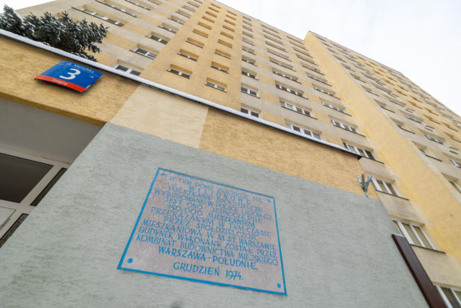 Blok mieszkalny z wielkiej płyty przy ulicy Marsylskiej 3 na warszawskich Stegnach. Widoczna tablica pamiątkowa o milionowym mieszkaniu spółdzielczym oddanym w PRL oraz numer ulicy. Więcej o architekturze wielkiej płyty na portalu Architektura Murator Plus.