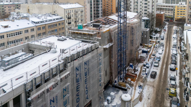 Zimowy widok z góry na plac budowy Muzeum Getta Warszawskiego, gdzie trwają prace wykończeniowe. Nowa konstrukcja, częściowo osłonięta siatkami z logo Adamietz, pokryta jest śniegiem, podobnie jak dachy okolicznych kamienic. Artykuł o postępach budowy na Architektura Murator Plus.