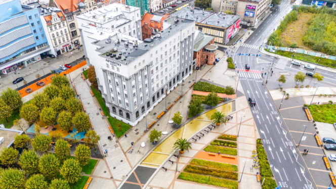 Monumentalne wnętrze Śląskiego Urzędu Wojewódzkiego w Katowicach z widocznymi marmurowymi balustradami, kolumnami oraz eleganckimi żyrandolami, oświetlonymi oknami i czarno-białą szachownicą na podłodze, symbolizujące siłę i bogactwo architektury międzywojennej, o czym przeczytasz na Architektura Murator Plus.