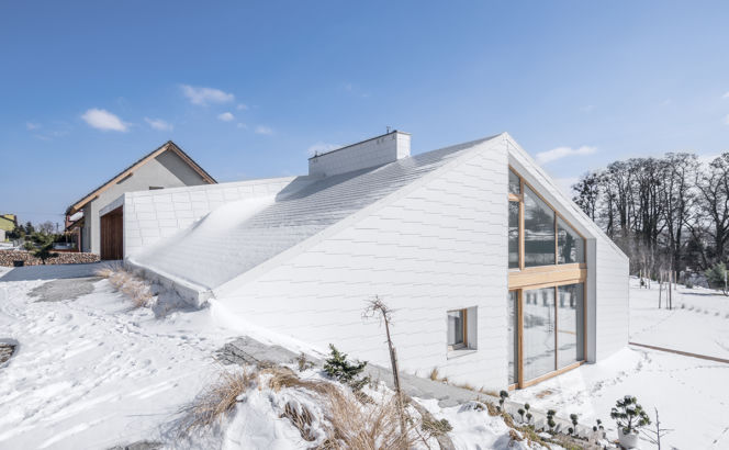 Nowoczesny dom na skarpie na Dolnym Śląsku, pokryty białymi płytami włókno-cementowymi, z częściowo ośnieżonym dachem i elewacją, widoczny pod słonecznym, błękitnym niebem. Duże drewniane okna wpisują się w krajobraz, o którym przeczytasz na Architektura Murator Plus.