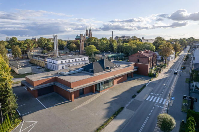 Widok z góry na Dom Pogrzebowy Koperski w Żyrardowie, ceglany budynek z latarnią doświetlającą i przeszklonym wejściem, połączony z historyczną zabudową. W tle zielone drzewa i fragment miasta, w tym kościół z wysokimi wieżami. Artykuł o tej realizacji na portalu Architektura Murator Plus.