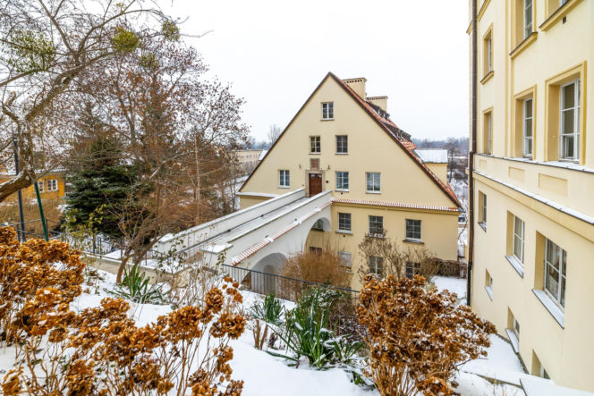 Taras Brzozowej 12, w tle mostek Domu Profesorów