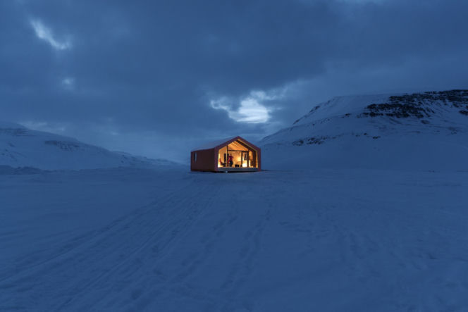 Oświetlony domek The Comfort Zone na tle pokrytych śniegiem gór Grenlandii. To baza dla klimatologów na wyspie Qeqertarsuag, o której więcej przeczytasz na Architektura Murator Plus. Nowoczesna architektura w ekstremalnych warunkach.