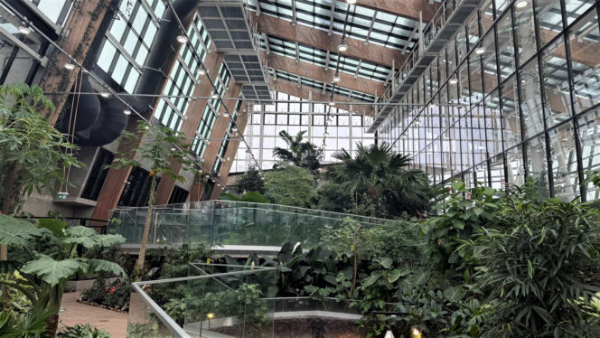 Wnętrze Egzotarium w Sosnowcu: bujna, egzotyczna roślinność, wysokie palmy i duże liście pod przeszklonym dachem, którego konstrukcja ze szkła i drewna tworzy geometryczne wzory, oświetlona punktowymi lampami. Więcej o architekturze tego obiektu na Architektura Murator Plus.