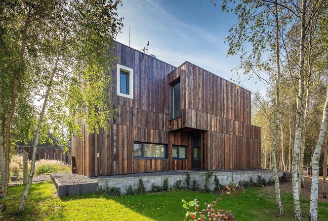 Nowoczesne elewacje z drewna sprawiają, że budynek daje wrażenie lżejszego, a przy tym intryguje oryginalnością zastosowanych połączeń faktur i barw