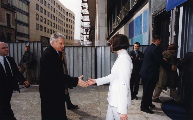 Ewa P. Porębska wita Premiera RP Jerzego Buzka pod gmachem warszawskiego Centrum Giełdowego przed ceremonią rozstrzygnięcia konkursu - budynek będący w trakcie budowy udostępniono dla celów Gali