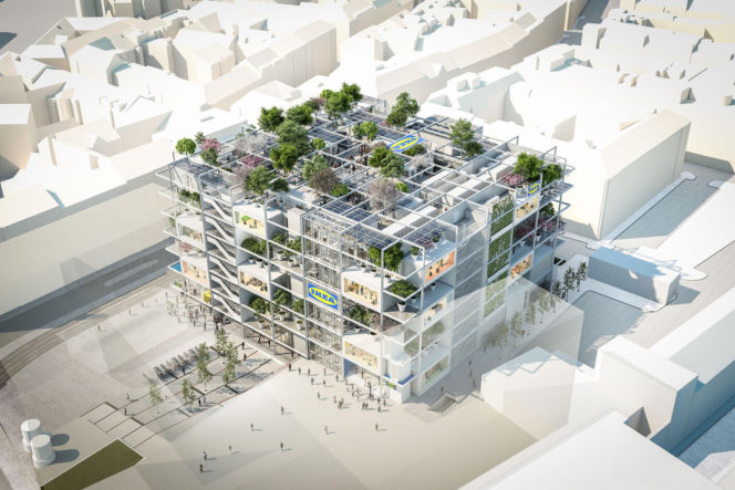 IKEA bez parkingu, za to z roślinami na elewacji, Wiedeń. Zaprojektowali ją architekci z pracowni Querkraft. Jest tu też hostel i taras na dachu