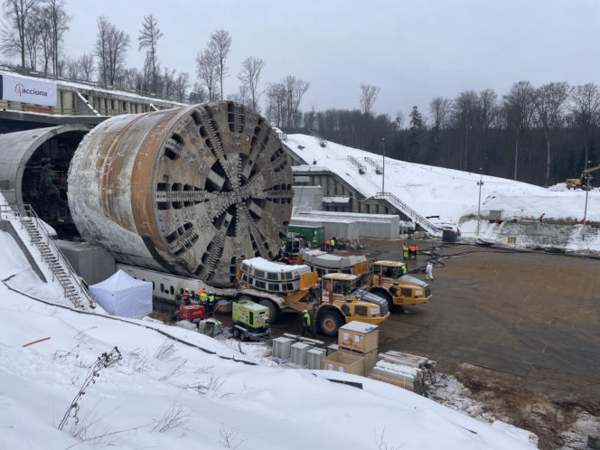 Maszyna TBM „Karpatka” na placu budowy tunelu S19 Rzeszów – Babica, gotowa do drążenia drugiej nitki. Obok pracownicy i ciężki sprzęt, w tle zaśnieżony teren. Więcej o tej inwestycji przeczytasz na portalu Architektura Murator Plus.