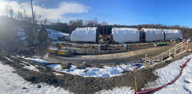 Maszyna TBM „Karpatka” na placu budowy tunelu S19 Rzeszów – Babica, gotowa do drążenia drugiej nitki. Obok pracownicy i ciężki sprzęt, w tle zaśnieżony teren. Więcej o tej inwestycji przeczytasz na portalu Architektura Murator Plus.