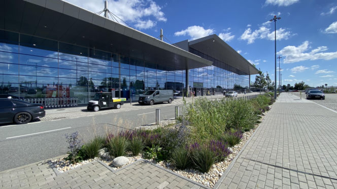 Nowoczesny terminal pasażerski C na lotnisku Katowice Airport w Pyrzowicach, z przeszkloną elewacją odbijającą błękitne niebo i białymi chmurami, otoczony zadbaną zielenią. Możesz przeczytać o rozbudowie lotniska na portalu Architektura Murator Plus.