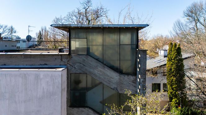 Willa na Katowickiej 7a w Warszawie, z charakterystyczną surową, betonową klatką schodową, inaugurującą brutalizm w stolicy. Obok willi widoczne są fragmenty zielonego terenu. Więcej o willi przeczytasz na Architektura Murator Plus.