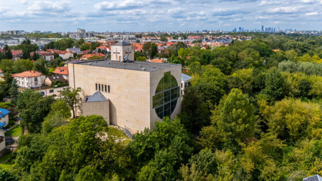 Nowoczesny kościół w Warszawie przy ul. Kokosowej, zaprojektowany przez Rafała Szczepańskiego, z prostopadłościenną bryłą, betonową fasadą i wielkim okrągłym oknem z przodu. Budynek otoczony jest gęstą zielenią drzew, a w tle widać osiedla domów i panoramę miasta, o czym przeczytasz na Architektura Murator Plus.