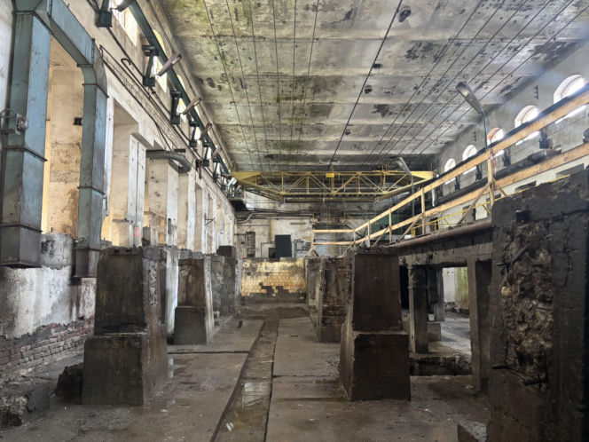 Wnętrze opuszczonej hali Królewskiej Papierni w Konstancinie-Jeziornie, z widocznymi zniszczonymi elementami konstrukcyjnymi i śladami po demontażu maszyn. Betonowy sufit z widocznymi instalacjami i liczne słupy, tworzące przestrzeń wymagającą rewitalizacji, o której przeczytasz na Architektura Murator Plus.