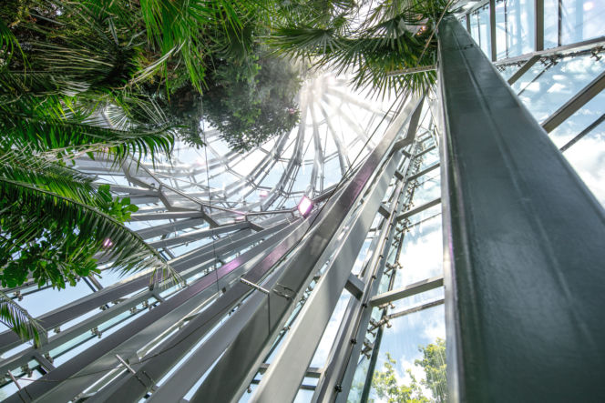 Wnętrze cylindrycznej, przeszklonej rotundy Palmiarni w Gdańsku Oliwie, z wysokimi palmami sięgającymi szczytu konstrukcji. Promienie słońca wpadające przez szklany dach. Więcej o nowej interpretacji parku Oliwskiego można przeczytać na Architektura Murator Plus.