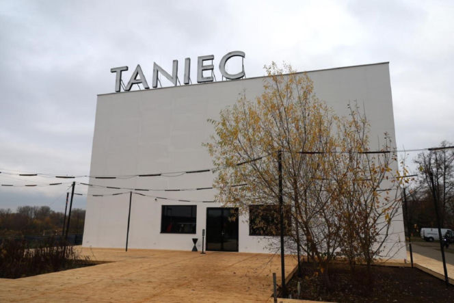 Biały pawilon TANIEC nad Wisłą w Warszawie, dawna siedziba Muzeum Sztuki Nowoczesnej, widziany w pochmurny dzień. Obiekt autorstwa Adolfa Krischanitza z literami "TANIEC" na dachu, otoczony zielenią i brukowaną ścieżką. To architektoniczna nowość, o której przeczytasz na Architektura Murator Plus.