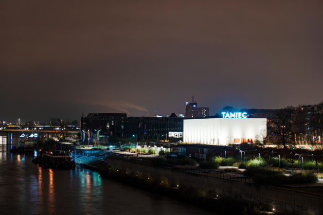 Biały Pawilon Tańca i Innych Sztuk Performatywnych w Warszawie nocą, rozświetlony i widoczny znad Wisły, z neonowym napisem "TANIEC" na dachu. Obiekt, który zyskał nową funkcję po opuszczeniu przez MSN, prezentuje architekturę nad Wisłą, o której czytaj na Architektura Murator Plus.