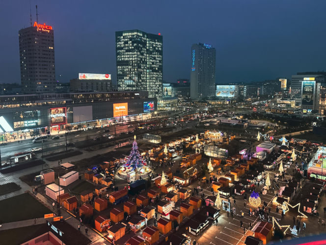 Wieczorny widok z góry na tętniący życiem Jarmark Warszawski w centrum Warszawy. Uwagę przykuwają stoiska handlowe, rozświetlona choinka i dekoracje świąteczne. W tle drapacze chmur, takie jak Amica i Novotel, oraz ulice z poruszającymi się autami. O tym, jak przestrzeń jarmarku zmienia miasto, przeczytasz na Architektura Murator Plus.