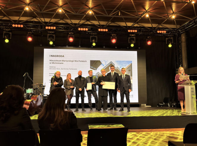 Uczestnicy gali konkursu Polski Cement w Architekturze na scenie, otrzymujący I nagrodę za Mauzoleum Martyrologii Wsi Polskich w Michniowie. Nagrodzone dzieło Nizio Design International to betonowa bryła architektoniczna, o której więcej przeczytasz na Architektura Murator Plus.