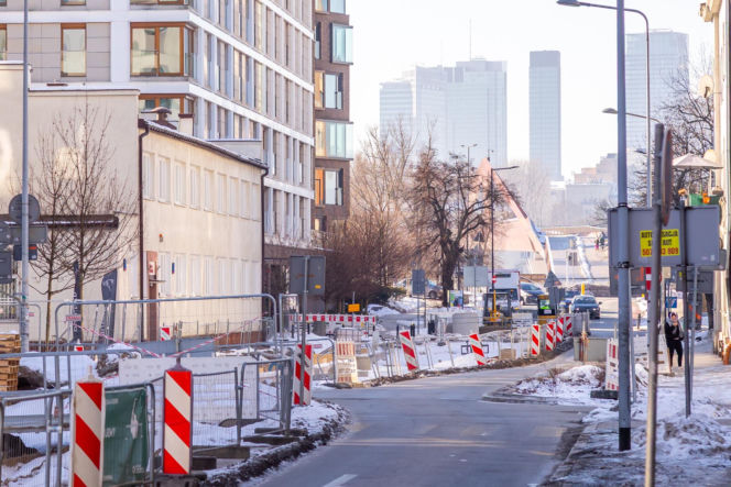 Ulica Okrzei w Warszawie zimą, z widocznymi elementami placu budowy: ogrodzeniami i znakami drogowymi. Po prawej piesza z torbą, a w tle nowoczesne budynki. Prace na ul. Okrzei, o których przeczytasz na Architektura Murator Plus, mają przekształcić ją w przestrzeń przyjazną dla pieszych i rowerzystów.