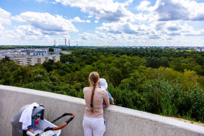 Widok z Kopca Powstania Warszawskiego w parku Akcji „Burza” przy ul. Bartyckiej