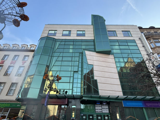 Nowoczesny biurowiec Solpol II z niebieskimi, szklanymi fasadami, autorstwa Wojciecha Jarząbka, stojący obok tradycyjnej kamienicy z czerwonym napisem „DENT”, symbolizuje trwanie w obliczu zmian urbanistycznych, o czym przeczytasz na Architektura Murator Plus.