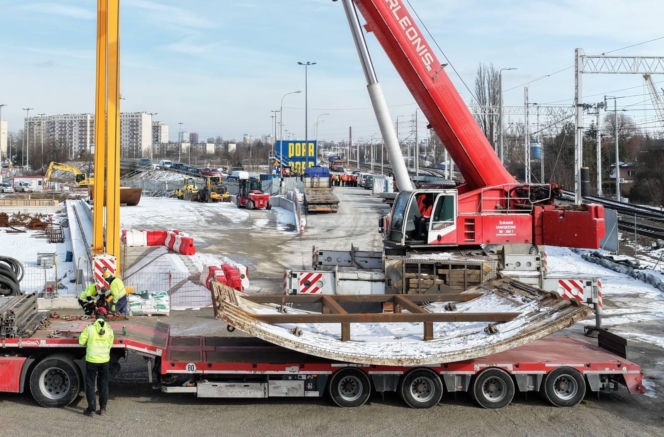 Punkt informacyjny CPK, promujący budowę tunelu kolejowego w Łodzi, z logo CPK i PORR oraz grafiką pociągu dużych prędkości, ukazujący nowoczesne wnętrze z meblami i materiałami informacyjnymi. Więcej o inwestycji przeczytasz na Architektura Murator Plus.