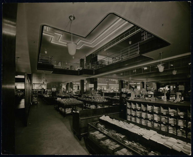 Wnętrze domu towarowego Wertheim w Breslau z 1930 roku, przedstawiające przestronną salę sprzedażową z rzędami ekspozytorów i luksusowych towarów. Widoczne są charakterystyczne oświetlenie sufitowe oraz otwarte przestrzenie, a także balustrady antresol, co stanowi ważny element historii Architektury Murator Plus.