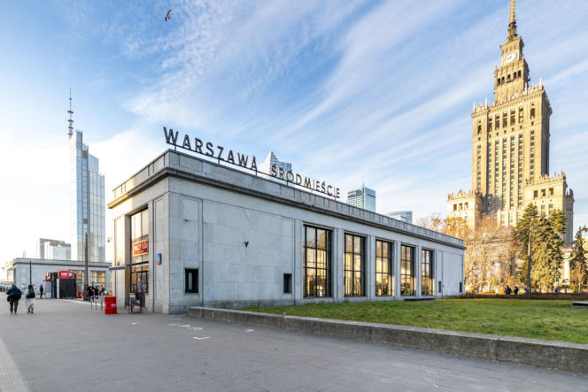 Budynek stacji kolejowej Warszawa Śródmieście, z napisem "WARSZAWA ŚRÓDMIEŚCIE" na dachu. W tle widoczny Pałac Kultury i Nauki, a także nowoczesne wieżowce. To doskonały przykład architektury powojennej, o której więcej przeczytasz na Architektura Murator Plus.