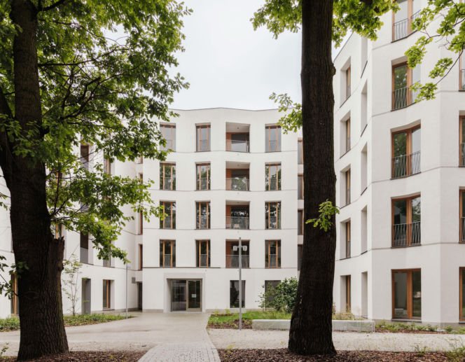 14 | Narożnik budynku. Gięte formy fasad podkreślone są rytmami głęboko osadzonych okien oraz liniami betonowych parapetów