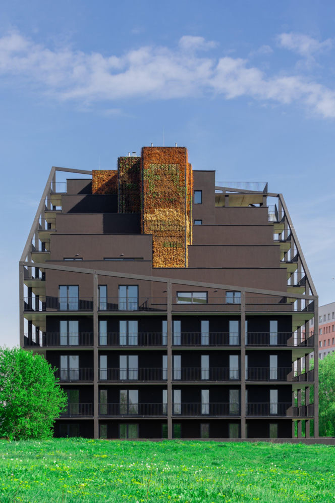 13 | Architektura budynku opiera się na zestawieniu uformowanych schodkowo mocnych brył mieszkań, pokrytej zielenią wieży klatki schodowej oraz delikatnej siatce konstrukcji oplatających blok tarasów