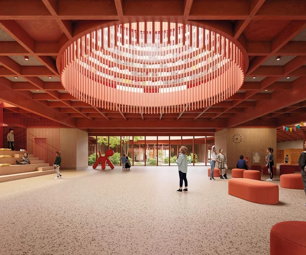 Konkursy na nowe szkoły podstawowe w Warszawie pokazują, jak architektura edukacyjna staje się dziś nośnikiem szerszych wartości. Dobrym przykładem jest szkoła przy ul. Świderskiej na Białołęce, zaprojektowana przez biuro Bujanowscy Architekci. Konkurs ogłoszono w 2020 roku, a nagrodzona koncepcja została już zrealizowana. Budynek dostosowano do ukształtowania terenu i istniejącego drzewostanu – skarpa wymusiła półpoziomy, a boisko przeniesiono na dach, co pozwoliło ocalić kilkanaście dorodnych dębów.