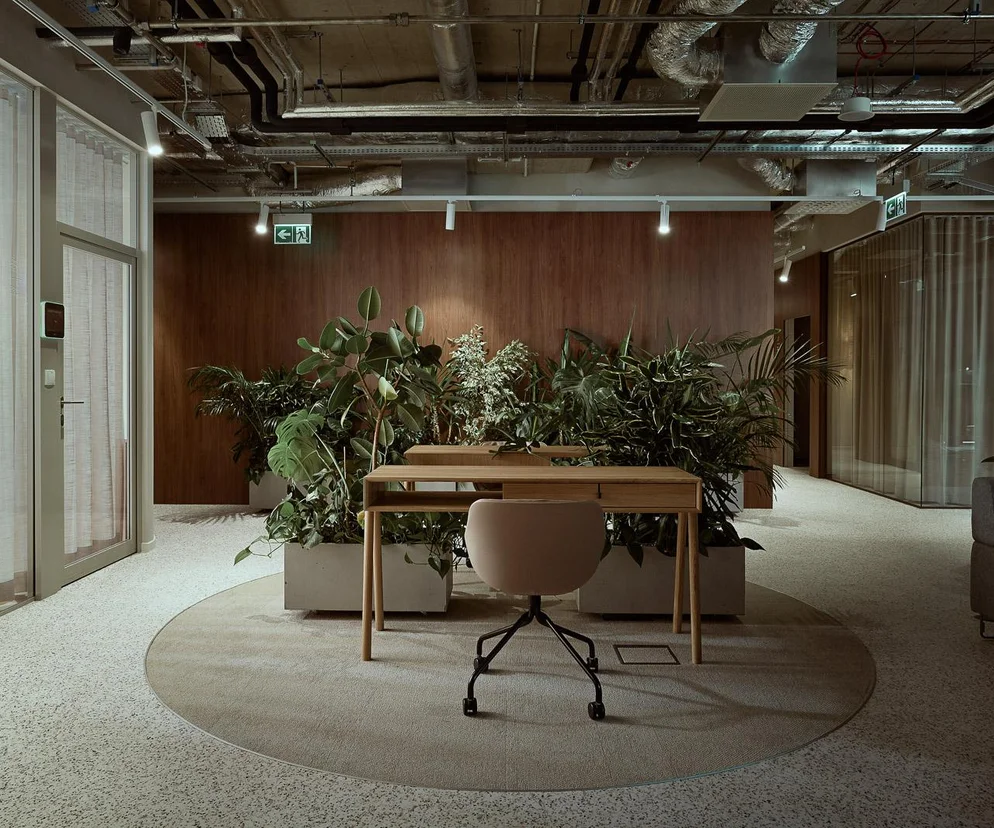 Projekt bazuje na idei „osmozy”, rozumianej jako płynne przenikanie się funkcji i przestrzeni. Wnętrze nie dzieli się sztywno na open space i sale konferencyjne – zamiast tego, mamy do czynienia z płynnym przechodzeniem między strefami: prywatnymi, półprywatnymi i wspólnymi. Motyw osmozy przejawia się również w warstwie materiałowej: zastosowano transparentne i półprzezroczyste struktury (szkło ryflowane, lekkie przegrody, gra światłem), które wspierają zarówno intymność, jak i otwartość. W przestrzeniach dominują naturalne materiały: drewno, tkaniny, zieleń – nadające wnętrzom domowy, przyjazny charakter. W biurze nie znajdziemy rzędu identycznych biurek – zamiast tego pojawiają się strefy o różnym charakterze: miejsca do pracy indywidualnej, komfortowe salki do wideorozmów, przestrzenie warsztatowe i sale spotkań.