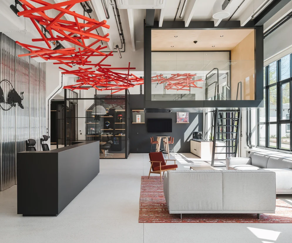 Naszym celem w czasie projektowania wnętrz nowej siedziby firmy Red Bull w hali poprzemysłowej w Forcie Mokotów było stworzenie komfortowego, zrównoważonego środowiska pracy, zapewniającego pracownikom na co dzień dobre samopoczucie, spokój i chęć do aktywności.