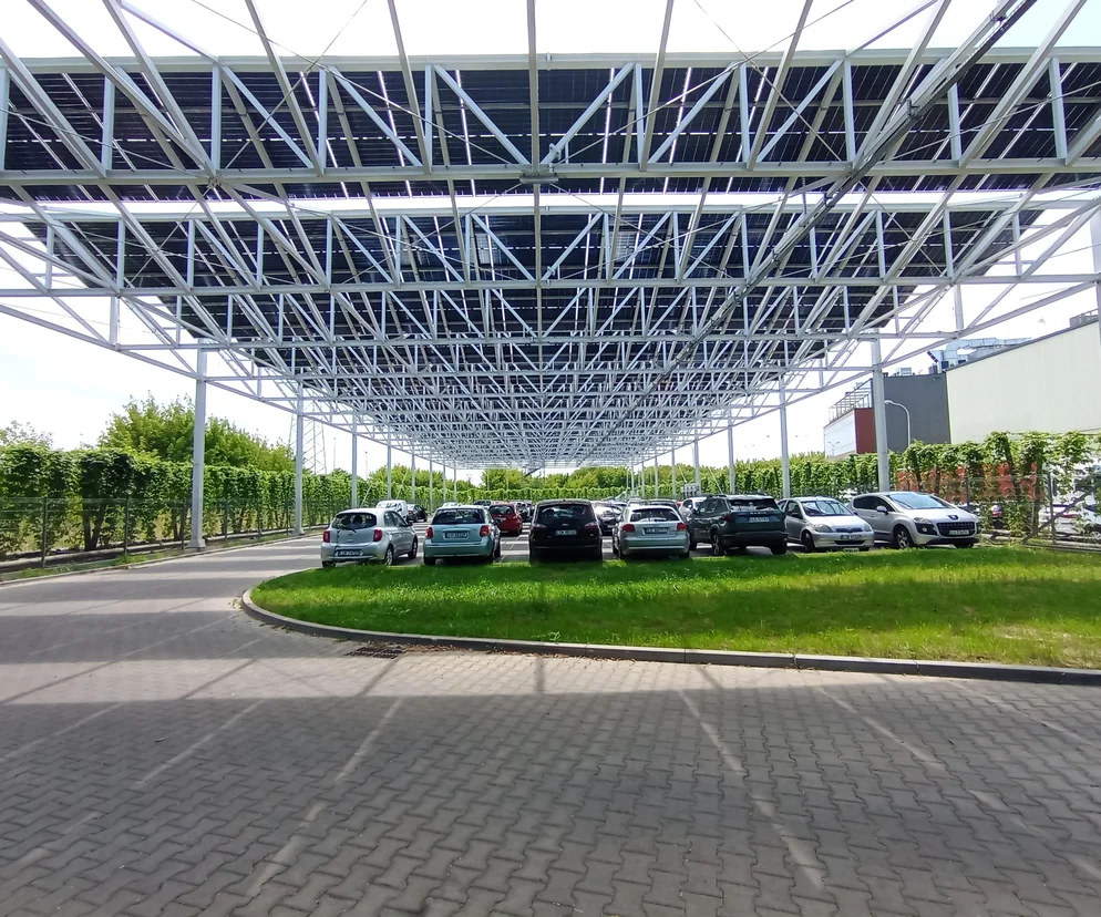 Ze względu na złożoną tektonikę istniejącej zabudowy przemysłowej oraz obecność licznych instalacji technologicznych generujących zacienienie, możliwości adaptacji dachów i elewacji były ograniczone. Analiza nasłonecznienia wykonana w oparciu o model cyfrowy wykazała, że najbardziej korzystną lokalizacją dla instalacji PV jest teren parkingu pracowniczego po przeciwnej stronie ul. Nadrzecznej. Zaprojektowano stalową konstrukcję wsporczą o rozpiętości 24,75 m i rozstawie podpór co 8,25 m, posadowioną na obwodzie parkingu.