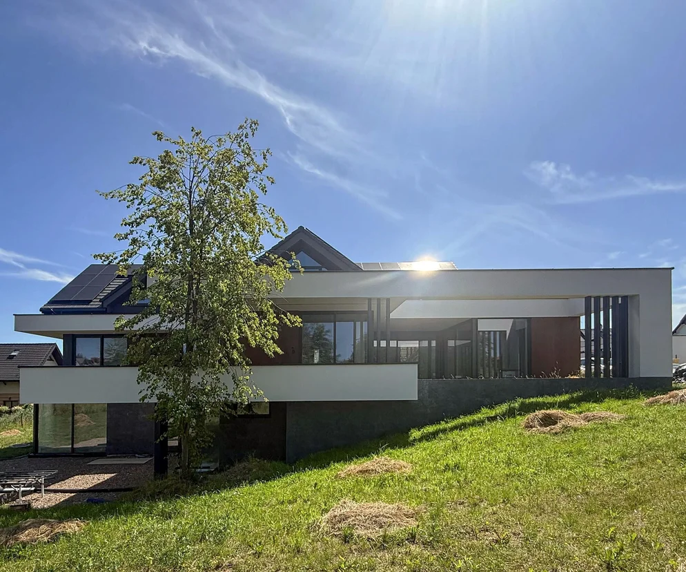 Podmiejska willa z patio to doskonałe połączenie funkcji, technologii i estetyki – a przy tym reakcja na lokalne uwarunkowania i marzenia Inwestorów. Po pierwsze – umiejętność ukrycia dachu skośnego za modernistycznymi ramami to dowód dużej wrażliwości projektowej. To zabieg, który nie tylko spełnia wymagania planu miejscowego, lecz także podnosi walor wizualny i nowoczesny charakter obiektu.