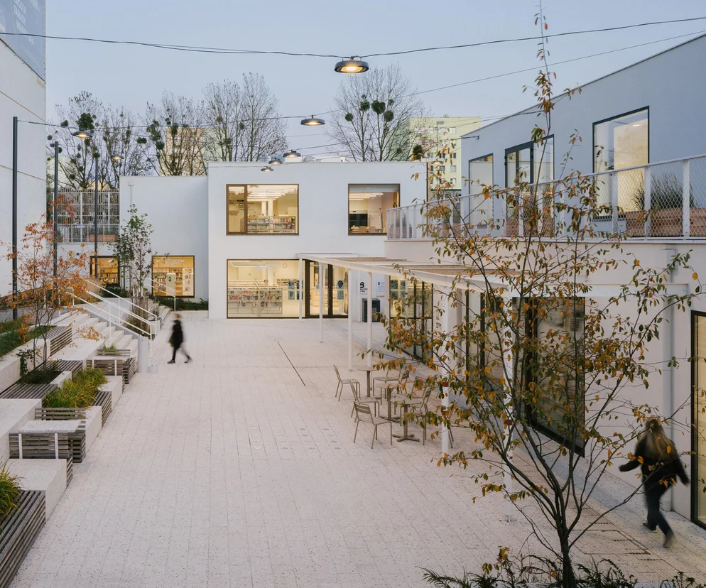 Budynki stanowią kompozycyjną i materiałową jedność z placem oraz elementami małej architektury. Posadzka placu z jasnego terrazzo łączy się z posadzką wnętrz budynków i przechodzi płynnie na tarasowe siedziska wokół placu, dzięki czemu uzyskano optyczne i fizyczne połączenie architektury i otoczenia. Amfiteatralna forma siedzisk umożliwia prowadzenie zajęć, spotkań czy plenerowych seansów filmowych i sprzyja integracji mieszkańców. Z myślą o osobach starszych zaplanowano siedziska w nasłonecznionej części placu oraz stoły szachowe zagłębione w zieleni. Cały kompleks wyposażony jest w spójny system identyfikacji i spełnia najwyższe standardy dostępności.