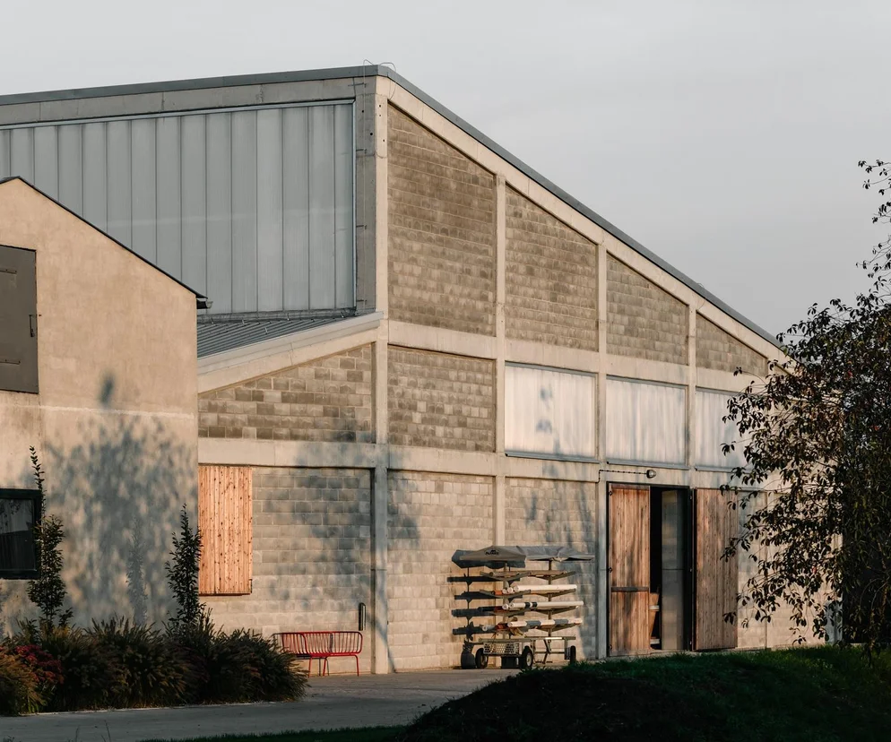 Unikalny kształt obiektu wynika z dostosowania do funkcji, optymalizacji przestrzeni, wkomponowania się w istniejącą zabudowę oraz oryginalnego, bezpiecznego dla zwierząt pomysłu na doświetlenie hali jeździeckiej. Budynek z odsłoniętą konstrukcją betonową wpisuje się w kontekst wiejskiego krajobrazu, stanowiąc współczesną interpretację okolicznych nieotynkowanych domów i obiektów przemysłowych z szedowymi dachami. Widoczna struktura budynku tworzy wyrazisty trójwymiarowy rysunek na elewacji podkreślony powstającym światłocieniem. Współpraca z konstruktorem była ważnym elementem procesu projektowego. Powstał budynek, który w całości oryginalnie eksponuje konstrukcję, a racjonalny dobór materiałów podkreślił skromny i szczery wygląd. Betonowe bloczki wypełniające ściany nie wymagały dodatkowego wykończenia, co pozwoliło ograniczyć zużycie materiałów i skrócić czas budowy. Obiekt nie jest ogrzewany, z wyjątkiem niewielkiej części socjalnej, dzięki czemu w stosunku do swojej skali zużywa niewiele energii i nie zanieczyszcza środowiska. Obniżenie dachu nad stajnią zmniejszyło niepotrzebną kubaturę i dopasowało skalę budynku do starych stajni, tworząc przyjemne w skali przejście między nimi. Pionowe przesunięcie bryły wykorzystano jako świetlik z poliwęglanu, który wpuszcza do wnętrza miękkie światło, nie tworząc niebezpiecznych kontrastów dla koni. Matowa powłoka świetlika jest również bezpieczna dla ptaków, a wieczorem budynek łagodnie świeci ponad starą zabudową. Wnętrza budynku są spójne.