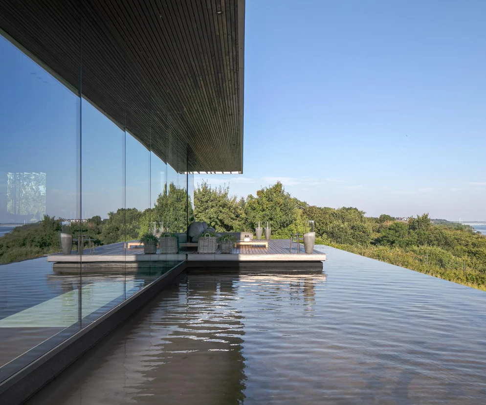 Forma głównej części budynku, stanowiąca drewnianą wstążkę, wznosi się wychodząc z ziemi, po czym przekręcona dwukrotnie we wnętrzu, wychodzi z budynku jako zawieszony nad wodą taras. Ten zabieg pozwolił nam nie stosować balustrad na tarasie, aby spotęgować poczucie bliskości przyrody i lekkiego zawieszenia w przestrzeni. Bezkrawędziowy basen, przylegający bezpośrednio do salonu i sypialni ma spowodować zbliżenie Wisły do domu, zlewając się z nią w jedną taflę wody.