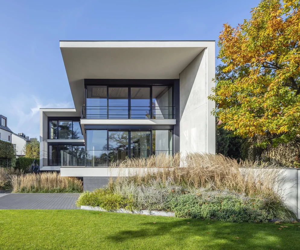 Dzięki zaprojektowanej złożonej topografii terenu, budynek częścią podziemnej kondygnacji przeznaczonej na wypoczynek otwiera się na południowy, ukryty ogród. Od strony ulicy i głównego wejścia, dom ma bardzo powściągliwą w formie, geometryczną i niczym nie wyróżniającą się płaską fasadę. Zastany krajobraz dobrze widoczny z wnętrza domu jest głównym protagonistą zaprojektowanej architektury.
