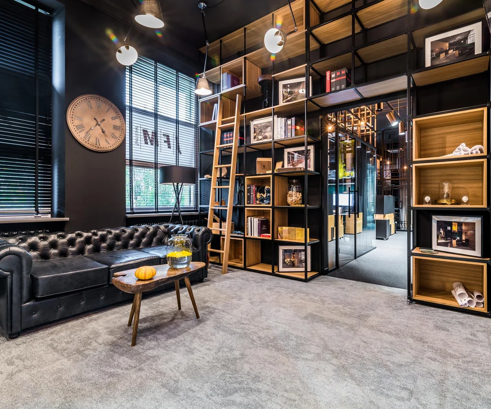 Biuro pełni podwójną funkcję, to zarówno efektywna przestrzeń pracy, jak i showroom, w którym firma prezentuje swoje możliwości wykonawcze. Przestrzeń zaprojektowano tak, aby użytkownik jak i klient doświadczał designu poprzez zmysły i materiał: surowy beton w części Loft, naturalne drewno i roślinność w części Las, eleganckie detale w Art Deco czy wyraziste kolory i tekstury w Contemporary.