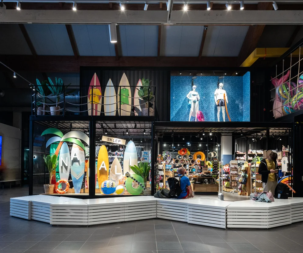 Koncepcja holu wejściowego inspirowana wspomnieniem nadmorskich wakacji. Projekt holu wejściowego czerpie z nostalgicznych wspomnień letnich wyjazdów nad polskie morze, przenosząc użytkowników w atmosferę portowego wybrzeża. Strefa szatni została zaprojektowana jako monumentalna suwnica portowa, nadająca przestrzeni industrialnego, ale jednocześnie znanego charakteru. Przylegający do niej sklep przywodzi na myśl ustawione w oczekiwaniu na załadunek kontenery morskie, budując spójną narrację przestrzenną. Elementy siedzisk zostały zaprojektowane z dużą dbałością o detale i znaczenia – część z nich nawiązuje do portowych polerów służących do cumowania statków, inne przywołują formę nadmorskich koszy plażowych.
