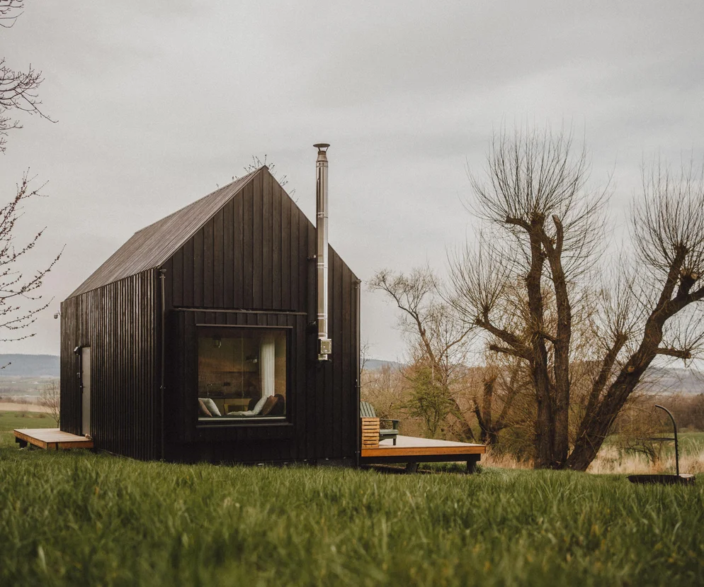 Drewno klejone krzyżowo to innowacyjny materiał, który ma bardzo bogate możliwości budowlane. Powierzchnia zabudowy wynosi 35 m2. Obiekt został zaplanowany na planie prostokąta o wymiarach: 8,8m x 4m. Zwieńczony tradycyjnym dwuspadowy dachem. Drewniana elewacja wykonana z modrzewia została utrzymana w ciemnej kolorystyce, dzięki czemu wpisuje się w krajobraz. Wejście zostało zaprojektowane od południowego-zachodu. Północno-wschodnią elewację tworzy duże przesuwne okno o szerokości 3,5 m oraz mniejsze okno z sypialni. Oba pomieszczenia otwierają się na przestronny taras, który okrąża budynek z trzech stron. Elewacja północna posiada wykusz z obszernym parapetem służącym za siedzisko.