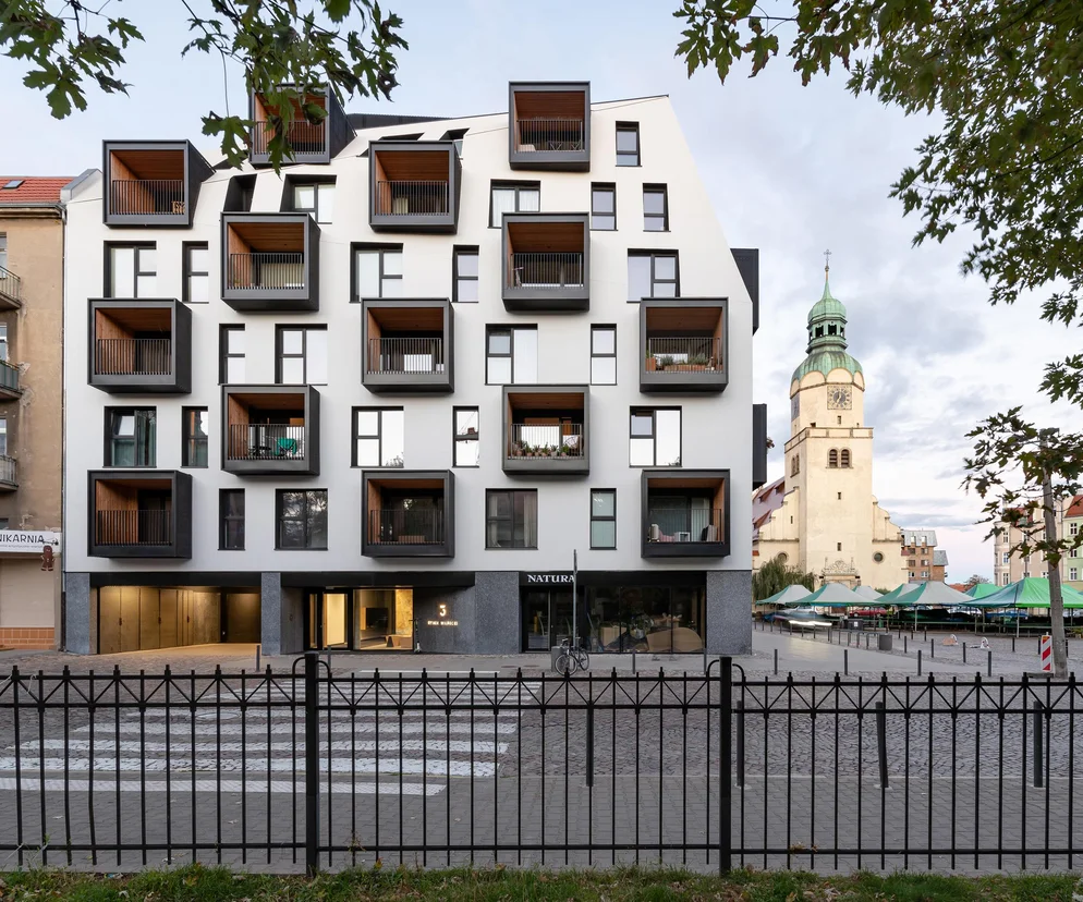 Forma: Budynek został urbanistycznie powiązany z otaczającą tkanką miejską poprzez charakterystyczne odchylenie od pionu ściany powyżej czwartej kondygnacji. Przełamanie to następuje na wysokości, na której znajdują się okapy dachu kościoła pw. Maryi Królowej oraz sąsiedniego budynku dawnej plebanii. Charakterystycznym elementem elewacji są loggie obudowane ciemnoszarą blachą cięto-ciągnioną, których wnętrza wyłożono naturalnymi deskami modrzewiowymi. Inspiracją do ich zaprojektowania były skrzynki na owoce i warzywa ze straganów targowiska wypełniającego płytę Rynku Wildeckiego – miejsca od dziesięcioleci będącego główną funkcją oraz sednem tożsamości społecznej i estetycznej tego placu.